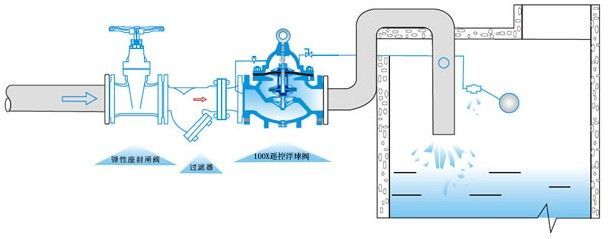100X遙控浮球閥由主閥、針閥、球閥、浮球閥、微型過濾器等組成水力控制接管系統(tǒng),調(diào)定后,自動(dòng)控制液面高度。本產(chǎn)品直接利用液面控制,不需要其它裝置和能源,保養(yǎng)簡便,液面控制準(zhǔn)確度高,不受水壓影響,密封可靠。 廣泛用于高層建筑、生活區(qū)等供水管網(wǎng)系統(tǒng)的水塔、水池等設(shè)施的液面控制。 100X遙控浮球閥--安裝示意圖