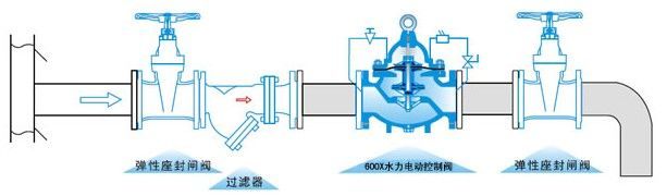 600X水力電動(dòng)控制閥由主閥、電磁導(dǎo)閥、針閥、球閥、微形過濾器和壓力表組成水力控制接管系統(tǒng)。通過電磁導(dǎo)閥可以實(shí)現(xiàn)對閥門開啟和關(guān)閉的遙控。加裝附加裝置后,可控制開啟和關(guān)閉的速度。本產(chǎn)品利用導(dǎo)閥控制閥門的開啟和關(guān)閉,節(jié)省能源。可代替其它閥門大型電動(dòng)裝置。 600X水力電動(dòng)控制閥--安裝示意圖