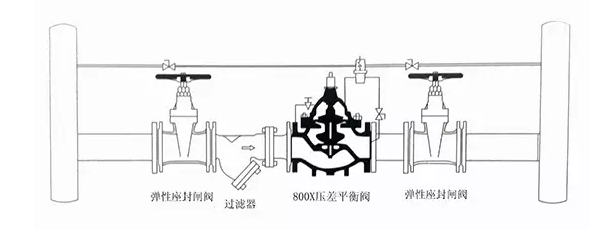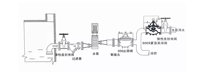 800X壓差旁通閥是一種用于空調(diào)系統(tǒng)供/回水之間以平衡壓差的閥門。該閥門可提高系統(tǒng)的利用率,保持壓差的精確互定直,并可最大限度地降低系統(tǒng)的噪音,以及過大壓差對設(shè)備造成的損壞。800X壓差旁通閥優(yōu)越于其他平衡閥的地方在于它沒有執(zhí)行機(jī)構(gòu),完全介質(zhì)自身的壓力差來達(dá)到平衡系統(tǒng)的功能,節(jié)約能源及安裝空間,是一種智能型閥門。 800X壓差旁通閥--安裝示意圖 900X緊急關(guān)閉閥用于生活供水和消防供水并聯(lián)供水系統(tǒng)中,正常情況供生活用水,當(dāng)火災(zāi)發(fā)生時(shí)消防用水時(shí),閥門自動(dòng)關(guān)閉生活用水,確保足夠的消防用水。當(dāng)消防停止用水時(shí)壓力減少,閥門自動(dòng)恢復(fù)生活用水,該閥使系統(tǒng)無須另設(shè)專門的消防單獨(dú)供水管網(wǎng),大大地節(jié)省了工程建設(shè)成本和日常的用水量。該閥控制靈敏、安全可靠、調(diào)試簡單、使用壽命長。