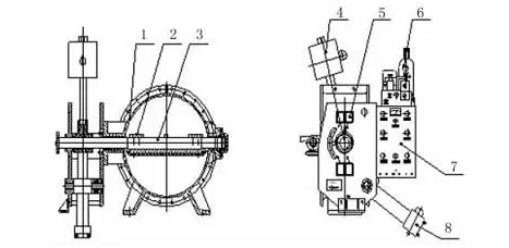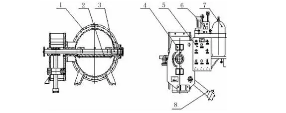 1-閥體;2-碟板;3-閥桿;4-重錘;5-行程開關(guān); 6-液壓站;7-電控柜;8-液壓缸 圖1 重錘式液控緩閉蝶閥