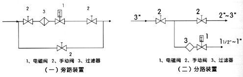 1、安裝時電磁閥線圈向上,并保持垂直位置,電磁閥上箭頭或標記應(yīng)與管道流向一致,不得安裝在有濺水或漏水的地方。 2、電磁閥的工作介質(zhì)應(yīng)清潔無顆粒雜質(zhì),電磁閥內(nèi)件表面上的污物及過濾器,需定期清潔干凈。 3、在電磁閥發(fā)生故障時,為了及時隔離電磁閥,并保證系統(tǒng)正常運行,最好安裝旁路裝置(如圖一)。 4、在管路系統(tǒng)中,安裝在支路上的電磁閥通徑應(yīng)小于主管道閥門的通徑(如圖二)。 5、安裝在電磁閥前,管道必須清洗干凈。建議在閥前安裝過濾器,蒸汽管道安裝疏水閥。 6、不能將閥安裝在管道的低凹處,以免因蒸汽冷凝水、雜質(zhì)等沉淀在閥內(nèi)而妨礙動作。 7、普通型不能在爆炸危險場合使用。 8、在管路剛性不足情況下,建議把閥前管道用支架固定,以免電磁閥工作時引起振動。 9、在安裝前,要注意要看清產(chǎn)品標牌,認真閱讀使用說明書,判斷產(chǎn)品是否符合使用條件。 10、電磁閥前后管道上需安裝壓力表,以便觀察管道壓力。