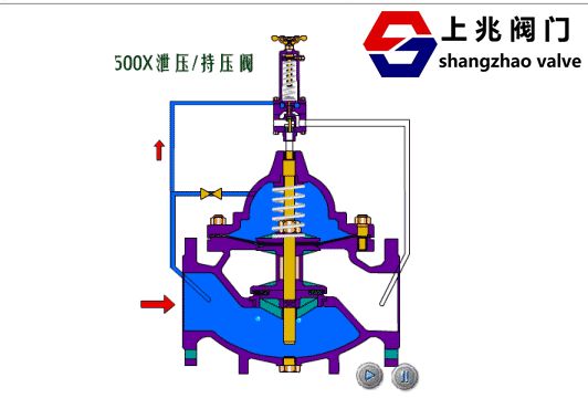 500X不銹鋼泄壓閥由主閥、泄壓/持壓導(dǎo)閥針閥、球閥、微形過濾器和壓力表組成水力控制接管系統(tǒng)。利用水力自動操作,即可以作泄壓閥用又可作持壓閥用。作泄壓閥用時,可維持供水路壓力在設(shè)定的安全值之下;做持壓閥用,可維持主閥上游水壓在設(shè)定值之上,保持主閥上游供水壓力。 1、作泄壓閥:當(dāng)泄壓/持壓導(dǎo)閥調(diào)整為泄壓狀態(tài)時,水通過針閥、主閥控制室、球閥A、泄壓/持壓導(dǎo)閥、球閥B流向出口,此時主閥處于開啟狀態(tài)。當(dāng)進口壓力超過泄壓/持壓導(dǎo)閥設(shè)定的安全值時,泄壓導(dǎo)閥會自動開啟,通過球閥C放出部分水,使管路泄壓。當(dāng)壓力恢復(fù)到安全值時,泄壓閥自動關(guān)閉。作泄壓閥時,各球閥常開。 2、作持壓閥:當(dāng)泄壓/持壓導(dǎo)閥調(diào)整為持壓狀態(tài)時,只要主閥進口水壓低于導(dǎo)閥設(shè)定值,導(dǎo)閥即關(guān)閉。主要控制室升壓,主閥關(guān)閉。當(dāng)主閥上游供水壓力超過導(dǎo)閥設(shè)定壓力時,持壓導(dǎo)閥才能打開,控制室的水經(jīng)球閥排至出口,控制室降壓主閥開啟,開始供水,即保持了上游水壓。作持壓閥用時,球閥C常閉或用絲堵?lián)Q下。 三、500X 不銹鋼泄壓閥--主要技術(shù)參數(shù):