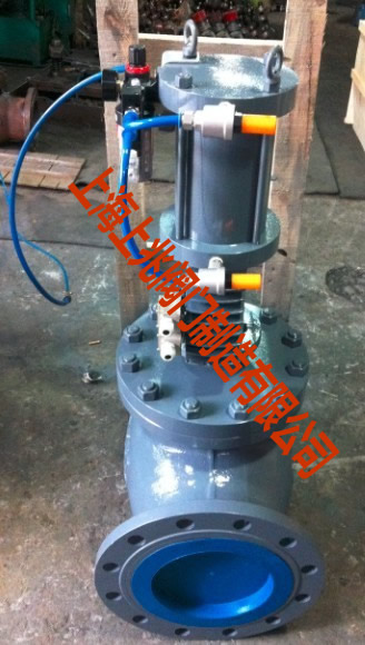 1.該氣動(dòng)抽氣止回閥采用獨(dú)立的逆止閥和輔助氣動(dòng)關(guān)閉裝置相結(jié)合的結(jié)構(gòu)型式(氣源用戶自備),當(dāng)汽輪機(jī)開(kāi)始工作時(shí),控制系統(tǒng)裝置中的氣源通過(guò)電磁換向閥進(jìn)入助關(guān)氣缸的下腔,推動(dòng)助關(guān)氣缸活塞向上移動(dòng),壓縮彈簧并使彈簧蓄能,閥板在管路介質(zhì)的推動(dòng)下開(kāi)啟。當(dāng)系統(tǒng)故障時(shí),管路介質(zhì)壓力降底,閥板在自身重力的作用下關(guān)閉,此時(shí)控制系統(tǒng)供氣電磁換向閥接受信號(hào)氣源換向,使氣體進(jìn)入助關(guān)氣缸的上腔,與彈簧一起推動(dòng)氣缸活塞向下移動(dòng),幫助閥板以最快的速度關(guān)閉,閥門(mén)在閥板關(guān)閉后從輔助動(dòng)力裝置獲得一定鎖閉閥板力,以防管路系統(tǒng)蒸汽和冷嶷水倒流,保護(hù)汽輪機(jī)等主要設(shè)備。 2.閥門(mén)執(zhí)行機(jī)構(gòu)采用氣開(kāi)式,一旦電磁換向閥接受信號(hào)氣源換向,執(zhí)行機(jī)構(gòu)彈簧和電磁換向閥氣源能使閥門(mén)迅速關(guān)閉,關(guān)閉時(shí)間0.5~1秒。