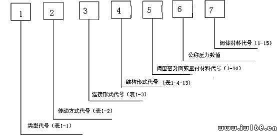 二、按用途,根據(jù)閥門的不同用途可分: 1. 開斷用:用來接通或切斷管路介質,如截止閥、閘閥、球閥、蝶閥等。 2. 止回用:用來防止介質倒流,如止回閥。 3. 調節(jié)用:用來調節(jié)介質的壓力和流量,如調節(jié)閥、減壓閥。 4. 分配用:用來改變介質流向、分配介質,如三通旋塞、分配閥、滑閥等。 5. 安全閥:在介質壓力超過規(guī)定值時,用來排放多余的介質,保證管路系統(tǒng)及設 備安全,如安全閥、事故閥。 6. 他特殊用途:如疏水閥、放空閥、排污閥等。 ![]() ![]() ![]() 三、按驅動方式,根據(jù)不同的驅動方式可分: 1. 手動:借助手輪、手柄、杠桿或鏈輪等,有人力驅動,傳動較大力矩時,裝有 蝸輪、齒輪等減速裝置。 2. 電動:借助電機或其他電氣裝置來驅動。 3. 液動:借助(水、油)來驅動。 4. 氣動;借助壓縮空氣來驅動。 四、按壓力,根據(jù)閥門的公稱壓力可分: 1. 真空閥:絕對壓力<0.1Mpa即760mm汞柱高的閥門,通常用mm汞柱或mm 水柱表示壓力。 2. 低壓閥:公稱壓力PN≤1.6Mpa的閥門(包括PN≤1.6MPa的鋼閥) 3. 中壓閥:公稱壓力PN2.5—6.4MPa的閥門。 4. 高壓閥:公稱壓力PN10.0—80.0MPa的閥門。 5. 超高壓閥:公稱壓力PN≥100.0MPa的閥門。 五、按介質的溫度分,根據(jù)閥門工作時的介質溫度可分: 1. 普通閥門:適用于介質溫度-40℃~425℃的閥門。 2. 高溫閥門:適用于介質溫度425℃~600℃的閥門。 3. 耐熱閥門:適用于介質溫度600℃以上的閥門。 4. 低溫閥門:適用于介質溫度-40℃~ -150℃的閥門。 5. 超低溫閥門:適用于介質溫度-150℃以下的閥門。 六、按公稱通徑分,根據(jù)閥門的公稱通徑可分: 1. 小口徑閥門:公稱通徑DN<40mm的閥門。 2. 中口徑閥門:公稱通徑DN50~300mm的閥門。 3. 大口徑閥門:公稱通徑DN350~1200mm的閥門。 4. 特大口徑閥門:公稱通徑DN≥1400mm的閥門。 七、按與管道連接方式分,根據(jù)閥門與管道連接方式可分; 1. 法蘭連接閥門:閥體帶有法蘭,與管道采用法蘭連接的閥門。 2. 螺紋連接閥門:閥體帶有內螺紋或外螺紋,與管道采用螺紋連接的閥門。 3. 焊接連接閥門:閥體帶有焊口,與管道采用焊接連接的閥門。 4. 夾箍連接閥門:閥體上帶有夾口,與管道采用夾箍連接的閥門。 5. 卡套連接閥門:采用卡套與管道連接的閥門。 第三節(jié) 閥門的型號編制方法 一、閥門的型號 閥門的型號是用來表示閥類、驅動及連接形式、密封圈材料和公稱壓力等要素的。 由于閥門種類繁雜,為了制造和使用方便,國家對閥門產品型號的編制方法做了統(tǒng)一規(guī)定。閥門產品的型號是由七個單元組成,用來表明閥門類別、驅動種類、連接和結構形式、密封面或襯里材料、公稱壓力及閥體材料。 閥門型號的組成由七個單元順序組成(見下表) ![]() 1.閥門的類型代號 表 1—1