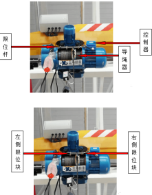 吊鉤下降時,鋼絲繩上的導繩器向左運動,當其與限位桿上的左限位塊(下降極限)相碰時,斷火限位器動作,吊鉤便立即停止下降。
