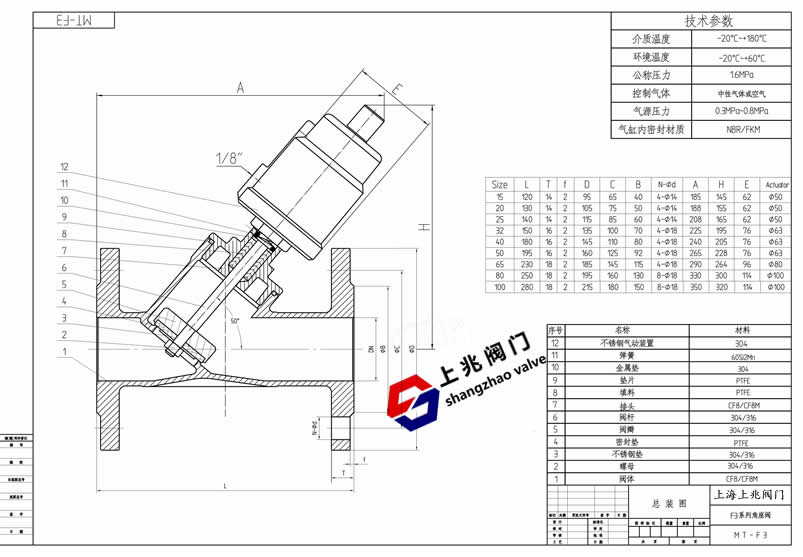 產(chǎn)品介紹 法蘭氣動(dòng)角座閥(不銹鋼頭)--工作原理: 在非工作狀態(tài)時(shí),由于彈簧力作用,閥門常閉(開)。當(dāng)執(zhí)行器活塞被壓縮氣體作用時(shí),閥門打開(關(guān)閉)。雙作用形式靠壓縮氣體控制閥門開關(guān)。 法蘭氣動(dòng)角座閥(不銹鋼頭)--應(yīng)用范圍: 啤酒飲料灌裝設(shè)備 制藥及醫(yī)療設(shè)備 印染紡織 化工行業(yè) 氣體工業(yè) 高溫滅菌 發(fā)泡機(jī)械 水/污水處理 法蘭氣動(dòng)角座閥(不銹鋼頭)--特點(diǎn): 流量大,流阻小,無水錘 Y型設(shè)計(jì),增加30%流量 超長(zhǎng)使用壽命 閥桿自動(dòng)校正,自潤(rùn)滑,免維護(hù) 氣缸采用不銹鋼材質(zhì),在惡劣環(huán)境中更加優(yōu)秀,可360°旋轉(zhuǎn)。 法蘭氣動(dòng)角座閥(不銹鋼頭)--技術(shù)參數(shù): 管道壓力:Max1.6Mpa(232psi) 控制壓力:0.3-0.8Mpa(43.5-116psi) 控制介質(zhì):中性氣體或空氣 閥體材料:CF8M/CF8(SS316,SS304) 密封材料:聚四氟乙烯 氣缸材料:CF8(SS304) 氣缸尺寸:27mm,32mm,40mm,50mm,63mm, 80mm,100mm,125mm 適用介質(zhì):水,酒精,油,染料,蒸汽,中性氣體或液體,有機(jī)溶劑,酸堿溶液 介質(zhì)溫度:-10℃-+180℃,25℃-+220℃ 環(huán)境溫度:-10℃-+80℃ 控制形式:?jiǎn)巫饔贸i],常開,雙作用常閉,雙作用自由態(tài) 連接形式:螺紋式,焊接式,法蘭式,快裝式