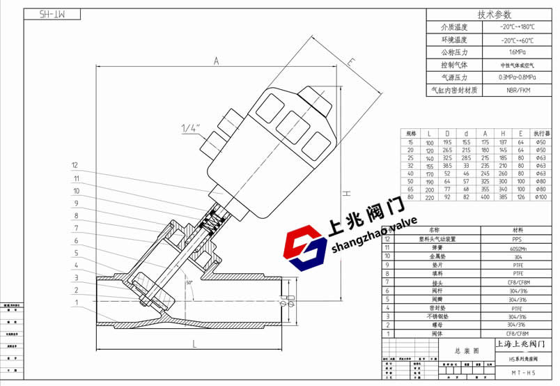 產(chǎn)品介紹 焊接氣動角座閥(塑料頭)--工作原理: 在非工作狀態(tài)時(shí),由于彈簧力作用,閥門常閉(開)。當(dāng)執(zhí)行器活塞被壓縮氣體作用時(shí),閥門打開(關(guān)閉)。雙作用形式靠壓縮氣體控制閥門開關(guān)。 焊接氣動角座閥(塑料頭)--應(yīng)用范圍: 啤酒飲料灌裝設(shè)備 制藥及醫(yī)療設(shè)備 印染紡織 化工行業(yè) 氣體工業(yè) 高溫滅菌 發(fā)泡機(jī)械 水/污水處理 焊接氣動角座閥(塑料頭)--特點(diǎn): 流量大,流阻小,無水錘 Y型設(shè)計(jì),增加30%流量 超長使用壽命 閥桿自動校正,自潤滑,免維護(hù) 氣缸采用不銹鋼材質(zhì),在惡劣環(huán)境中更加優(yōu)秀,可360°旋轉(zhuǎn)。 焊接氣動角座閥(塑料頭)--技術(shù)參數(shù): 管道壓力:Max1.6Mpa(232psi) 控制壓力:0.3-0.8Mpa(43.5-116psi) 控制介質(zhì):中性氣體或空氣 閥體材料:CF8M/CF8(SS316,SS304) 密封材料:聚四氟乙烯 氣缸材料:塑料PPS 氣缸尺寸:27mm,32mm,40mm,50mm,63mm, 80mm,100mm,125mm 適用介質(zhì):水,酒精,油,染料,蒸汽,中性氣體或液體,有機(jī)溶劑,酸堿溶液 介質(zhì)溫度:-10℃-+180℃,25℃-+220℃ 環(huán)境溫度:-10℃-+80℃ 控制形式:單作用常閉,常開,雙作用常閉,雙作用自由態(tài) 連接形式:螺紋式,焊接式,法蘭式,快裝式 焊接氣動角座閥(塑料頭)圖紙: ![]() | ||