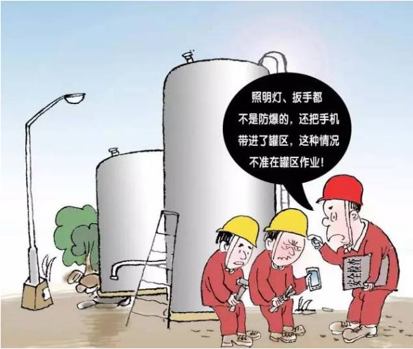 本條規(guī)定了油氣加工、調(diào)和過(guò)程中各種添加劑、助劑使用安全管理要求。 在添加使用前要了解添加劑、助劑的物化性質(zhì),并進(jìn)行風(fēng)險(xiǎn)評(píng)估,制定相應(yīng)的控制措施和應(yīng)急預(yù)案,操作過(guò)程中要使用專門(mén)的加劑系統(tǒng),嚴(yán)格履行操作規(guī)程。 8.嚴(yán)禁在油氣罐區(qū)使用非防爆照明、電氣設(shè)施、工器具和電子器材 本條主要規(guī)定了油氣罐區(qū)防爆器材的使用要求。油氣罐區(qū)儲(chǔ)存的介質(zhì)一般都具有易燃易爆等特點(diǎn),在油氣罐區(qū)使用非防爆工具、電氣設(shè)施、通訊器材等,存在較大安全隱患,容易引發(fā)事故。 9.嚴(yán)禁培訓(xùn)不合格人員和無(wú)相關(guān)資質(zhì)承包商進(jìn)入油氣罐區(qū)作業(yè),未經(jīng)許可機(jī)動(dòng)車輛及外來(lái)人員不得進(jìn)入罐區(qū)