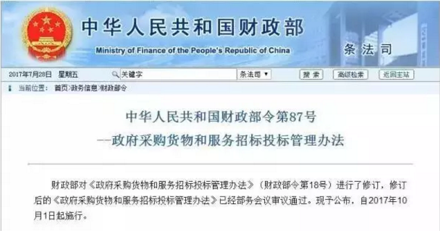 2017年10月1日起施行“最低價中標”說再見! 近日,財政部印發(fā)財政部令87號《政府采購貨物和服務招標投標管理辦法》,該《辦法》提出:評標委員會認為投標人的報價明顯低于其他通過符合性審查投標人的報價,有可能影響產(chǎn)品質量或者不能誠信履約的,應當要求其在評標現(xiàn)場合理的時間內提供書面說明,必要時提交相關證明材料;投標人不能證明其報價合理性的,評標委員會應當將其作為無效投標處理。 ![]() 該《辦法》有如下幾點,需要大家注意: 第一、該投標價格與其他投標人相比的價格,參照對象是“其他投標人的價格”,此處不是大家常說的“成本價”,因為“成本價”有時的確很難直接判定,爭議也很大,直接與“其他標人的價格”相對比,易操作,例如:若九個投標人,八個投標人報價為1億左右,另一位若是8000萬,可能就需要進行“合理性”解釋。 第二、價格明顯低于其他投標人的報價情況下,有可能影響產(chǎn)品質量或者不能誠信履約。這里用詞是“有可能”,可以認為若價格過低,都存在“有可能”,所以免不了要澄清。 第三、應當要求其在評標現(xiàn)場合理的時間內提供書面說明,必要時提交相關證明材料。這里要注意的是“評標現(xiàn)場合理的時間”,這個意義重大,避免了場外人情,也是說“投標”是否有效,當場決定。 第四、投標人不能證明其報價合理性的,評標委員會應當將其作為無效投標處理。這里用詞是“應當”,而不是“可以”,就是該《辦法》直接規(guī)定這種情況就是“無效投標”。 目前,一些地方在招投標中存在的“低價中標”現(xiàn)象,導致在最低價中標的競爭中,呈現(xiàn)良者退出和劣者胡來的困局。這已經(jīng)成為企業(yè)提升產(chǎn)品質量的突出障礙,亟待治理和規(guī)范。而在基建和地產(chǎn)行業(yè)。最低價中標往往使承建商無利可圖甚至賠本吆喝,承建商的應對手段往往是工程停建、惡意拖欠薪酬等。最低價中標往往從單純的經(jīng)濟糾紛,發(fā)酵成社會問題。 87號令要求有可能影響產(chǎn)品質量或者不能誠信履約的報價提供說明或證明其合理性,勢必對最低價中標的現(xiàn)象帶來一定遏制,“餓死同行、累死自己、坑死業(yè)主”現(xiàn)象有望得到改善! 中華人民共和國財政部令第87號 ——政府采購貨物和服務招標投標管理辦法 財政部對《政府采購貨物和服務招標投標管理辦法》(財政部令第18號)進行了修訂,修訂后的《政府采購貨物和服務招標投標管理辦法》已經(jīng)部務會議審議通過。現(xiàn)予公布,自2017年10月1日起施行。 部長 肖捷 2017年7月11日 第一章 總 則 第一條 為了規(guī)范政府采購當事人的采購行為,加強對政府采購貨物和服務招標投標活動的監(jiān)督管理,維護國家利益、社會公共利益和政府采購招標投標活動當事人的合法權益,依據(jù)《中華人民共和國政府采購法》(以下簡稱政府采購法)、《中華人民共和國政府采購法實施條例》(以下簡稱政府采購法實施條例)和其他有關法律法規(guī)規(guī)定,制定本辦法。 第二條 本辦法適用于在中華人民共和國境內開展政府采購貨物和服務(以下簡稱貨物服務)招標投標活動。 第三條 貨物服務招標分為公開招標和邀請招標。 公開招標,是指采購人依法以招標公告的方式邀請非特定的供應商參加投標的采購方式。 邀請招標,是指采購人依法從符合相應資格條件的供應商中隨機抽取3家以上供應商,并以投標邀請書的方式邀請其參加投標的采購方式。 第四條 屬于地方預算的政府采購項目,省、自治區(qū)、直轄市人民政府根據(jù)實際情況,可以確定分別適用于本行政區(qū)域省級、設區(qū)的市級、縣級公開招標數(shù)額標準。 第五條 采購人應當在貨物服務招標投標活動中落實節(jié)約能源、保護環(huán)境、扶持不發(fā)達地區(qū)和少數(shù)民族地區(qū)、促進中小企業(yè)發(fā)展等政府采購政策。 第六條 采購人應當按照行政事業(yè)單位內部控制規(guī)范要求,建立健全本單位政府采購內部控制制度,在編制政府采購預算和實施計劃、確定采購需求、組織采購活動、履約驗收、答復詢問質疑、配合投訴處理及監(jiān)督檢查等重點環(huán)節(jié)加強內部控制管理。 采購人不得向供應商索要或者接受其給予的贈品、回扣或者與采購無關的其他商品、服務。 第七條 采購人應當按照財政部制定的《政府采購品目分類目錄》確定采購項目屬性。按照《政府采購品目分類目錄》無法確定的,按照有利于采購項目實施的原則確定。 第八條 采購人委托采購代理機構代理招標的,采購代理機構應當在采購人委托的范圍內依法開展采購活動。 采購代理機構及其分支機構不得在所代理的采購項目中投標或者代理投標,不得為所代理的采購項目的投標人參加本項目提供投標咨詢。 第二章 招 標 第九條 未納入集中采購目錄的政府采購項目,采購人可以自行招標,也可以委托采購代理機構在委托的范圍內代理招標。 采購人自行組織開展招標活動的,應當符合下列條件: (一)有編制招標文件、組織招標的能力和條件; (二)有與采購項目專業(yè)性相適應的專業(yè)人員。 第十條 采購人應當對采購標的的市場技術或者服務水平、供應、價格等情況進行市場調查,根據(jù)調查情況、資產(chǎn)配置標準等科學、合理地確定采