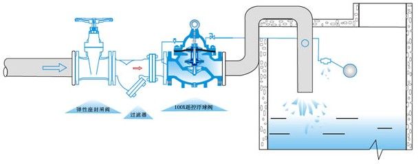 當(dāng)管道從進(jìn)水端給水時(shí),由于針閥、球閥、浮球閥是常開(kāi)的,水通過(guò)微型過(guò)濾器、針閥、控制室、球閥、浮球閥進(jìn)入水池,此時(shí)控制室不形成壓力,主閥開(kāi)啟,水塔(池)供水。