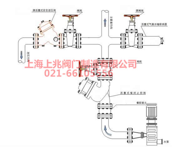 六、YQ98002型過(guò)濾活塞式安全泄壓閥--安裝方式及連接要求: 一、根據(jù)工況的減壓特性,必須在該閥前安裝 閘閥; 二、方便日后對(duì)該閥進(jìn)行檢修工作.必須在減壓閥后安裝可曲繞軟連接; 三‘最佳安裝方式為臥式,其它方位也可以接受; 四、必須留出足夠的工作空間方便檢修; 五、吊裝時(shí)采用有效措施進(jìn)行.也可利用該閥吊環(huán)進(jìn)行。 七、YQ98002型過(guò)濾活塞式安全泄壓閥--安裝圖: