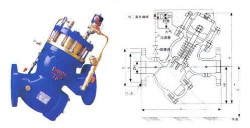 產(chǎn)品介紹 一、YQ98006型過濾活塞式電磁控制閥--產(chǎn)品概述: YQ98006型過濾活塞式電磁控制閥由主閥、電磁導(dǎo)閥、針閥、球閥、微形過濾器組成水力控制接管系統(tǒng);通過電磁導(dǎo)閥可以實(shí)現(xiàn)對(duì)閥門開啟和關(guān)閉的遙控,當(dāng)閥門從進(jìn)口端給水時(shí),水流流過針閥進(jìn)入主閥上腔控制室,當(dāng)電磁導(dǎo)閥打開時(shí),控制室內(nèi)的水經(jīng)電磁導(dǎo)閥、球閥流出。球閥開度大于針閥開度,主閥上腔控制室內(nèi)壓力變低,主閥處于全開狀態(tài);當(dāng)電磁導(dǎo)閥關(guān)閉時(shí)。 主閥上腔控制室的水不能流出,控制室升壓,推動(dòng)活塞關(guān)閉主閥;本產(chǎn)品利用導(dǎo)閥控制閥門的開啟和關(guān)閉,反映準(zhǔn)確快速,采用三向電磁閥,維護(hù)簡(jiǎn)單;安裝于各類給水系統(tǒng)的管道上。 二、YQ98006型過濾活塞式電磁控制閥--工作原理: 分隔膜型和活塞型兩類,主要部件有一個(gè)主閥及其附設(shè)的導(dǎo)管、導(dǎo)閥、針閥、球閥和壓力表等組成的。它利用上下游壓力差為動(dòng)力,由導(dǎo)閥控制、使隔膜(活塞)上方控制室內(nèi)的壓力水被排到大氣或下游低壓區(qū)時(shí),作用在閥盤底部和隔膜下方的壓力值就大于上方的壓力值,所以將主閥閥盤推到完全開啟的位置,當(dāng)進(jìn)入隔膜(活塞)上方控制室內(nèi)的壓力不能排到大氣或下游低區(qū)時(shí),作用在隔膜(活塞)上方的壓力值就大于下方的壓力值,所以就會(huì)把主閥閥盤壓到完全關(guān)閉位置,當(dāng)隔膜(活塞)上方控制室內(nèi)的壓力值處于入口壓力與出口壓力中間時(shí),主閥閥盤就處于調(diào)節(jié)狀態(tài)。 三、YQ98006型過濾活塞式電磁控制閥--技術(shù)參數(shù):
