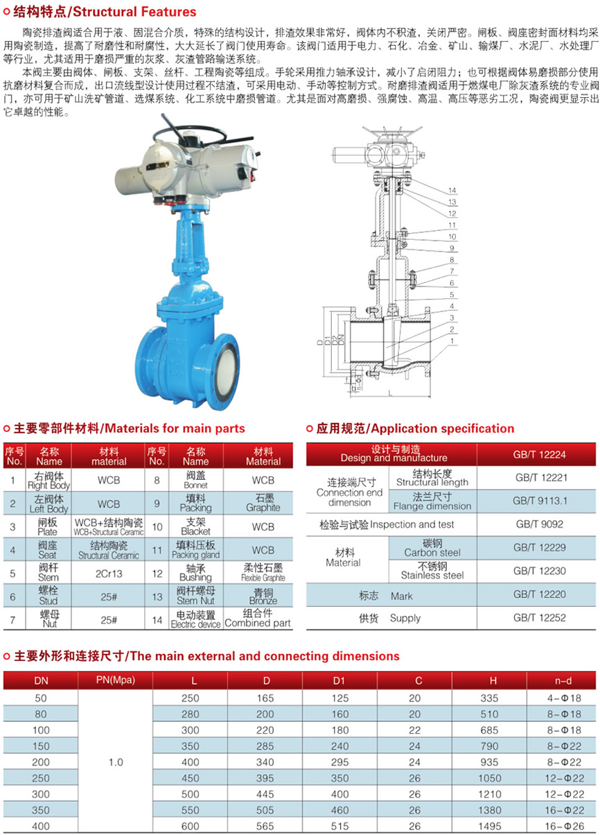 產(chǎn)品介紹 PZ941TC電動耐磨陶瓷排渣閥產(chǎn)品概述: PZ941TC 電動耐磨陶瓷排渣閥適用于公稱壓力P N 1.6~6.4Mpa,工作溫度0~100℃的火力電站水利排渣系統(tǒng)及水利工程的灰漿排放系統(tǒng)管路上,切斷或接通管路中聽介質(zhì),適用介質(zhì)為:灰水混合物,渣水混合物。 PZ941TC電動耐磨陶瓷排渣閥優(yōu)點: PZ941TC 電動耐磨陶瓷排渣閥主要應(yīng)用于電力、石油、化工、冶金、采礦、污水處理等工業(yè)領(lǐng)域,尤其是面對高磨損、強腐蝕、高溫、高壓等惡劣工況,陶瓷閥更顯示出它卓越的性能。 PZ941TC 電動耐磨陶瓷排渣閥能滿足高磨損、強腐蝕的使用環(huán)境,尤其突出的特點是超長的使用壽命,陶瓷閥門的性能價格比遠(yuǎn)遠(yuǎn)優(yōu)于其它同類金屬閥門。 PZ941TC電動耐磨陶瓷排渣閥結(jié)構(gòu)優(yōu)勢與特點: 1、 采用中法蘭螺栓連接,支管兩端為法蘭連接結(jié)構(gòu)。 2、 啟閉件采用半密封副強制密封,性能優(yōu)良。 3、 密封副材料為耐磨合金,耐磨性強、耐沖蝕、耐擦傷、摩擦力小、密封可靠。 4、 閥體出流道線型合理,不存渣,啟閉靈活,不卡阻。 5、 閥桿表面經(jīng)調(diào)質(zhì)及氮化處理,有良好的抗腐蝕性,抗擦傷和耐磨性。 6、 中大口徑設(shè)置滾動軸承,啟閉輕松。 PZ941TC電動耐磨陶瓷排渣閥試驗壓力: