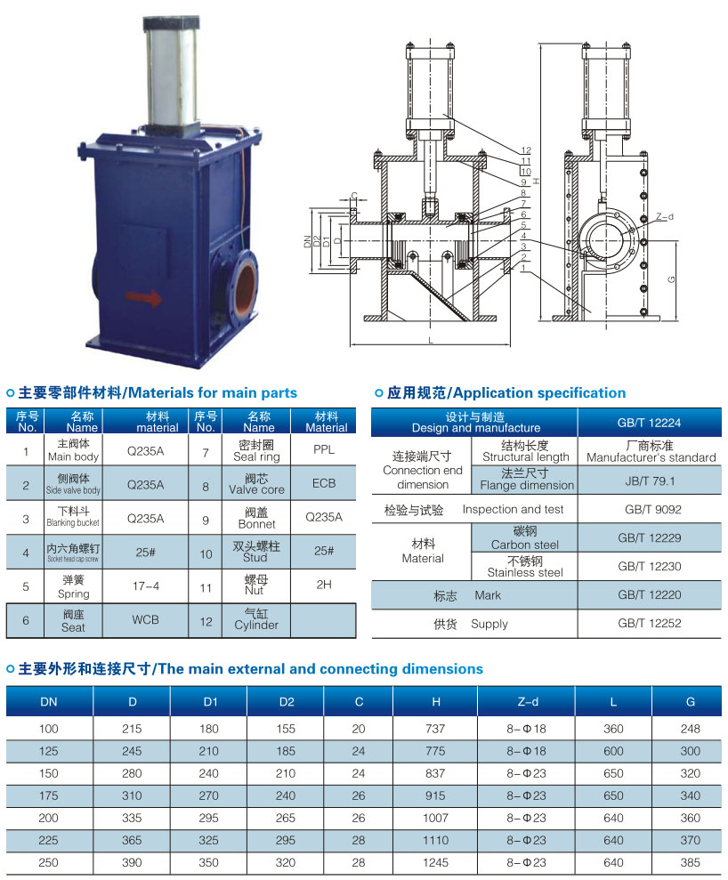 安裝前應(yīng)將閥門清洗干凈,并消除在運(yùn)輸過程中可能造成的缺陷。仔細(xì)核對(duì)閥門上的標(biāo)識(shí)及銘牌是否符合使用要求。本閥門只能安裝在水平管道上。若長期存放,應(yīng)存在于干燥通風(fēng)的室內(nèi),定期檢查,防止生銹。運(yùn)輸過程中防止磕碰。 庫頂切換閥--技術(shù)參數(shù): 1、 公稱通徑: DN50~900mm(2”~36”) 2、 公稱壓力: PN1.0~4.0MPa(150~300Lb) 3、 適用溫度: ≤200℃ 4、 適用介質(zhì):灰渣、泥渣、煤渣、礦漿、污水等 5、 應(yīng)用范圍:電力、石化、冶金、建材等工藝控制系統(tǒng) 6、 材質(zhì): 碳鋼 不銹鋼等 ![]() | ||