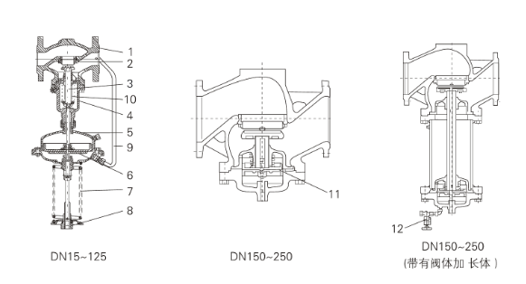 | 結(jié)構(gòu)簡圖 | | 1 | 2 | 3 | 4 | 5 | 6 | 7 | 8 | 9 | 10 | 11 | 12 | | 閥體 | 閥座 | 閥軸 | 閥蓋 | 膜蓋 | 膜片 | 彈簧 | 調(diào)節(jié)螺母 | 導壓管 | 波紋管 | 平衡膜片 | 充注閥 |